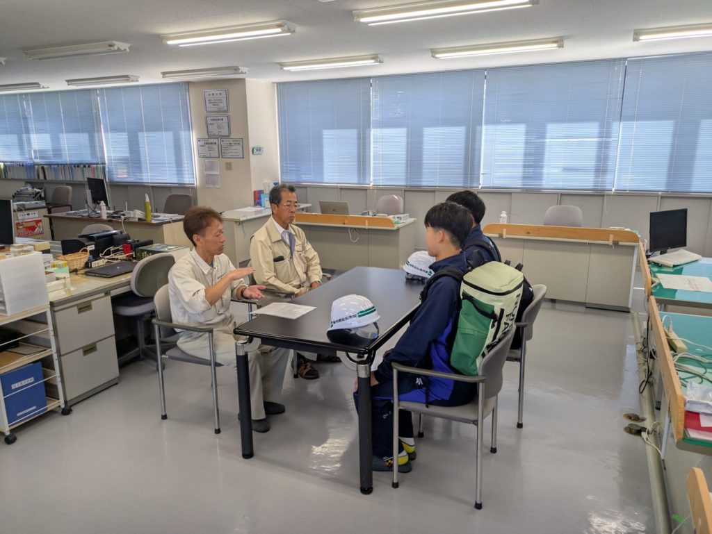 当日は2名の生徒が職場体験学習に参加し、24日には倶知安町での道路維持業務体験、およびニセコ町での農業土木工事見学を行いました。25日には京極町で、橋梁補修工事、道路工事などの見学を行い、完成した工事ではありますが京極町内で当社が施工した護岸、防雪柵などの機能や施工方法を実際の現地に行って説明を受けてもらいました。1日目は比較的晴天に恵まれたものの、2日目はあいにくの雨模様で少し肌寒い天気となってしまっていたのですが、学生さんたちは現場技術者の説明を熱心に聞いていました。